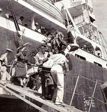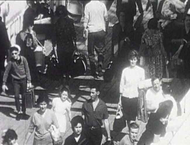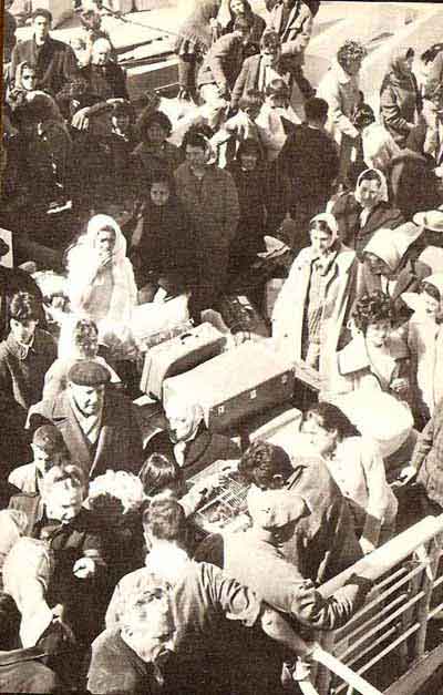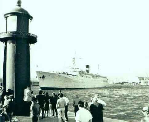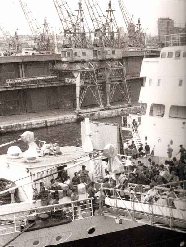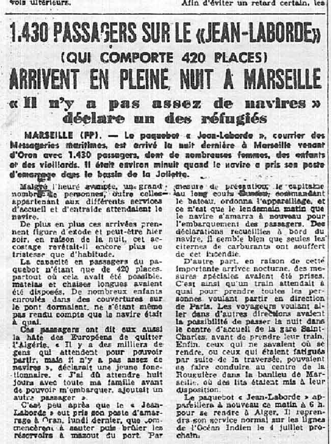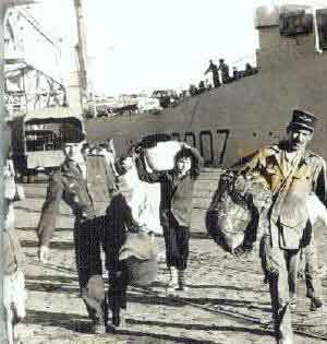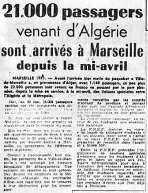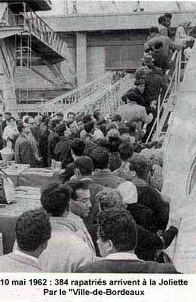 ...Le 27 mai 1962, le El Mansour, en provenance de Mers-el-Kébir, transportait neuf cents Pieds-Noirs qui accostèrent à Port-Vendres en chantant La Marseillaise et Le Chant des Africains. D'autres paquebots (El Djezaïr, le Kairouan, le Sidi-bel-Abbes, le Cazalet...), des cargos (le Canigou, le Rélizane...) et même des chalutiers (le Deux-Sourds, le Tout va bien, l'Émilia, l'Espérance...) firent traverser la mer à des milliers de familles qui n'emportaient avec elles que quelques valises. Parfois, des bateaux repartaient avec des soldats d'origine maghrébine démobilisés par l'armée française et reconduits dans leur pays devenu souverain pour y connaître un avenir plus qu'incertain...