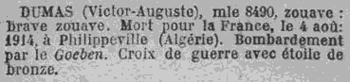 - DUMAS Victor Auguste, né le 6 juin 1891 à Cublize (Rhône), décédé le 4 août 1914 " à l'Hôpital mixte de Philippeville des suites de blessures occasionnées par le bombardement de Philippeville ", Soldat de 1re classe, 3e Régiment de marche de zouaves, Matricule n° 8.490, classe 1911, n° 652 au recrutement du Rhône.