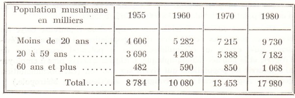 La situation démographique, problème fondamental de l'Algérie, conditionne toute la politique économique et sociale. Peuplé de 2 500 000 habitants en 1856, ce territoire comptait au 1er janvier 1957, dix millions d'habitants (militaires exclus), dont un million de non-Musulmans (tous civils) et neuf millions de Musulmans. La population algérienne a donc quadruplé en cent ans ; alors qu'elle représente moins de 3 p. mille de la population mondiale, elle s'accroît annuellement dans une proportion qui est de 1% de l'accroissement de la population mondiale. Cette cadence déjà rapide s'est accélérée considérablement au cours des dernières années. En l'absence de mouvements migratoires importants, l'accroissement annuel de la population est dû à l'excédent des naissances sur les décès qui s'est établi à 265000 en 1956, soit en valeur relative 2,65 %. Ce taux est un des plus forts du monde.